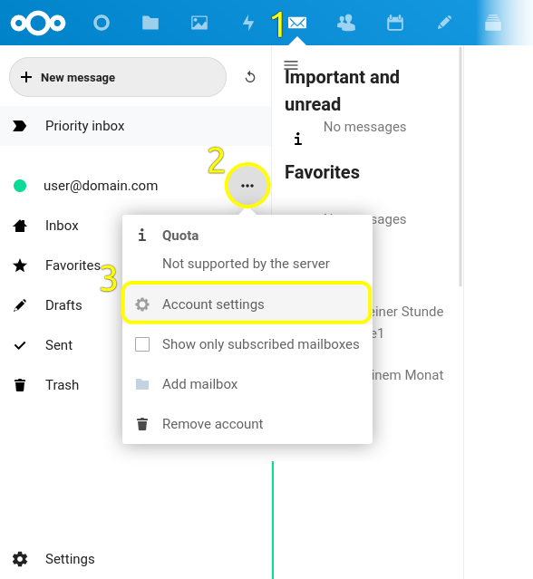Go into your Nextcloud Mail app (1), and click on the 3-dot-menu next to the email account you want to configure sieve for (2).