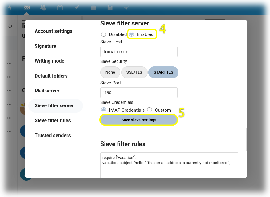 Check that it is enabled (4), and if not, select enabled and click Save sieve settings (5).