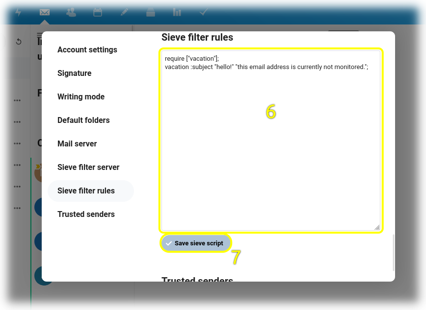 Scroll further down to Sieve filter rules, add your rules (6), e.g.,
